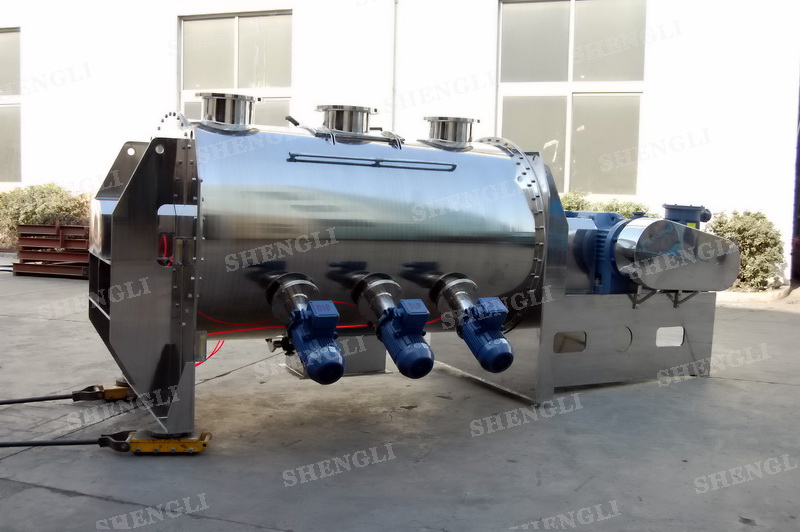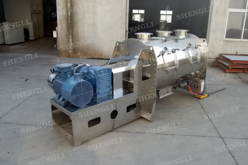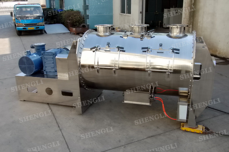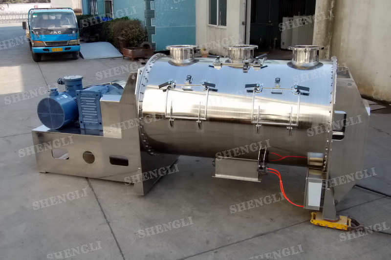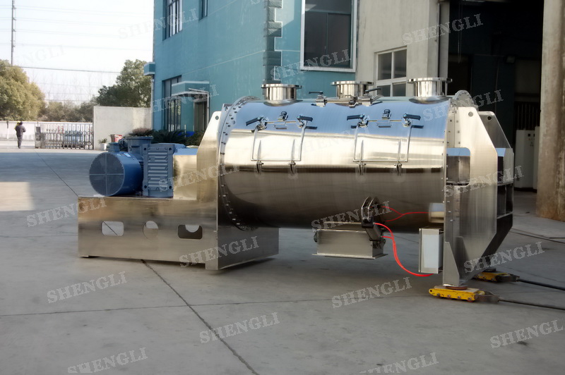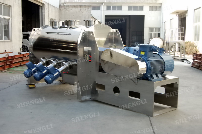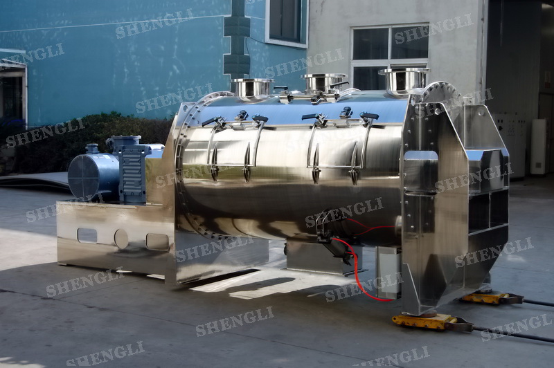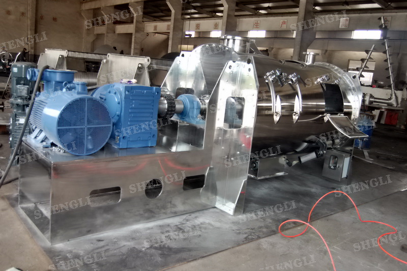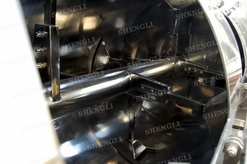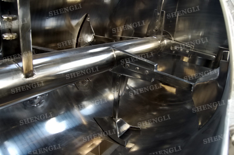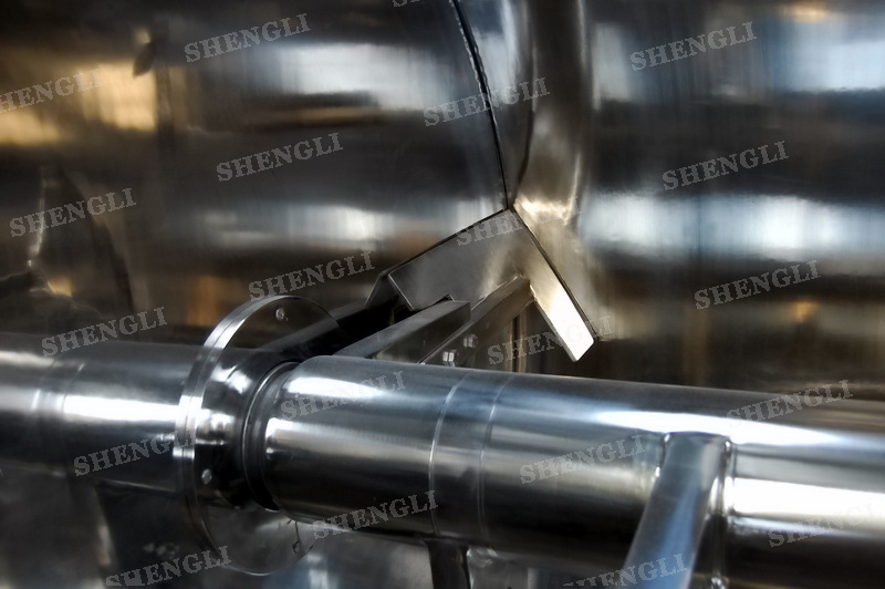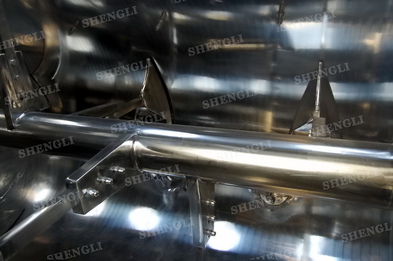 工作原理:犁刀攪拌機(jī)采用臥式圓柱筒體,內(nèi)設(shè)平行主軸,主軸上安裝若干犁式刀頭,通過(guò)較快的旋轉(zhuǎn)速度,分割、重合物料,實(shí)現(xiàn)快速攪拌的功能,常結(jié)合1500-3000轉(zhuǎn)高速剪切飛刀相互作用。