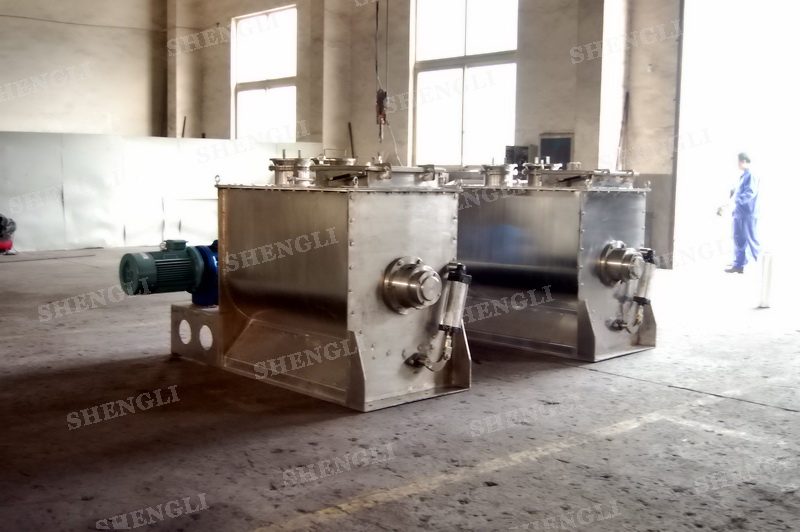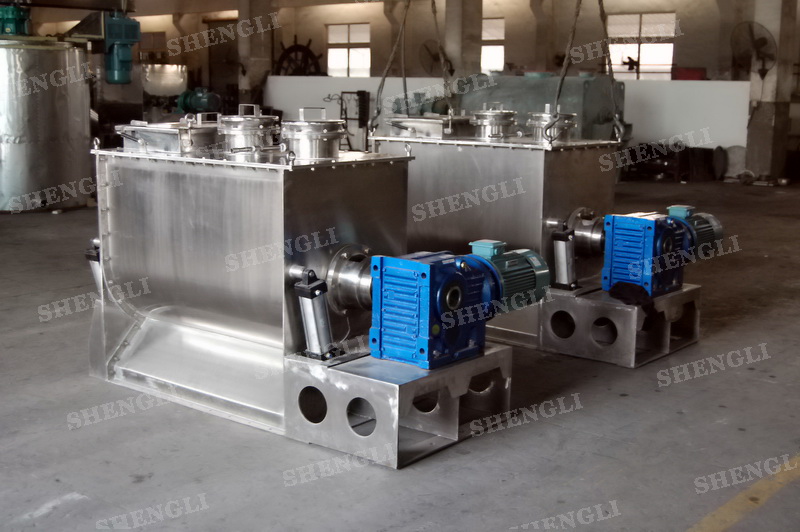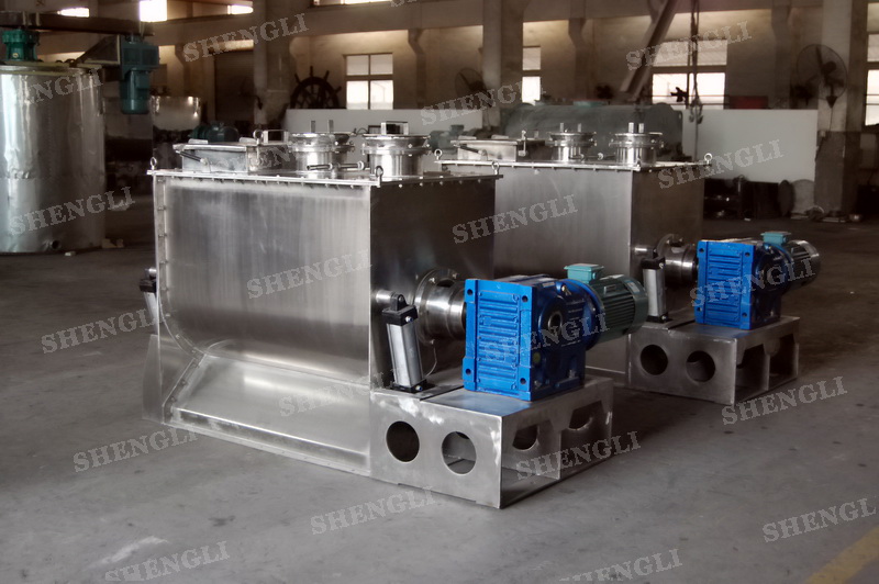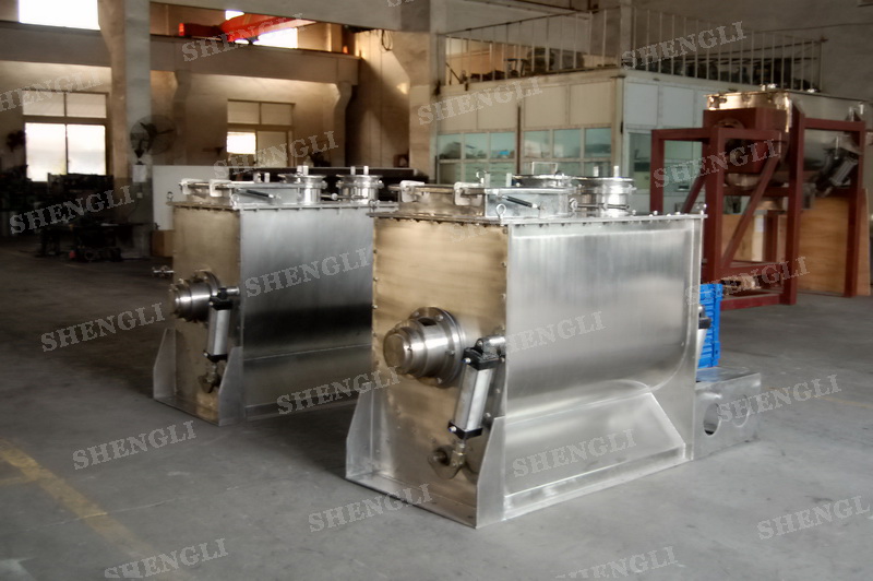 工作原理:螺帶式混合機采用U型筒體,內裝平行主軸,主軸上安裝正反雙向的盤條螺帶,不同維度螺帶分內螺帶與外螺帶,物料在螺帶的驅使下反復參混,能夠快速高效的混合。
