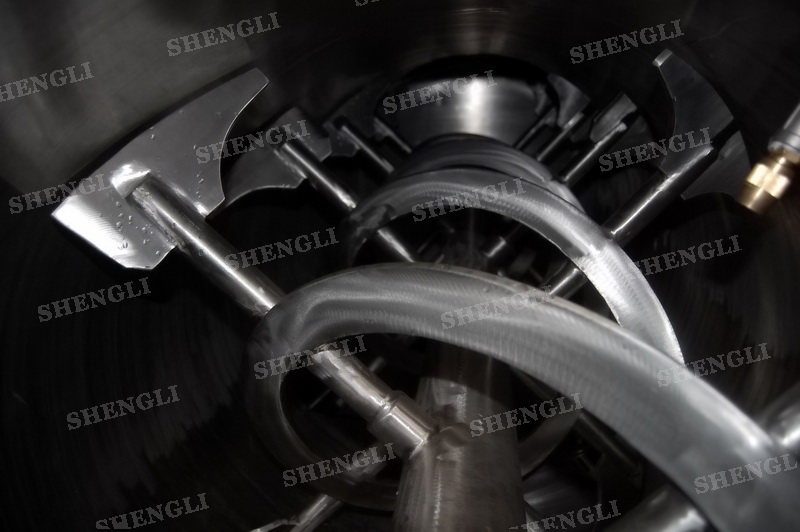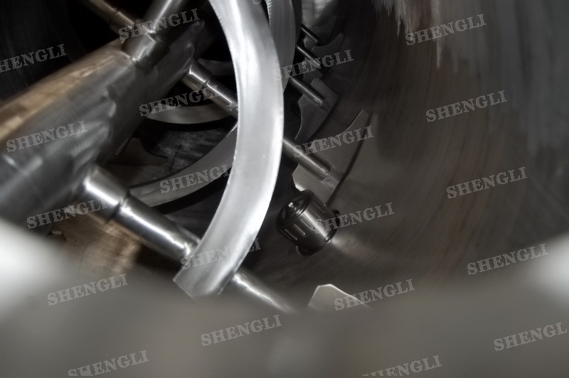設(shè)備配置:配置K系列減速機(jī)、垂直安裝;設(shè)備采用圓形筒體;筒側(cè)加裝高速飛刀;設(shè)備主軸與飛刀主軸采用機(jī)械密封;設(shè)備內(nèi)外表面拉絲拋光。